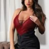 Camisola sem bojo de decote profundo com recortes únicos, esta relação entre as cores e o modelo com strapp deixou esta camisola super autentica, toda em cetim dando um toque de leveza