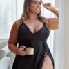 Invista em você e sinta-se única com a Camisola Preta Plus Size em Cetim com Fenda na Lateral em Renda. Garanta já a sua e viva uma experiência de luxo incomparável!