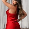 A combinação do cetim suave ao toque com os recortes laterais em renda cria uma estética que valoriza as curvas e exala sensualidade. A camisola vermelha tem alças reguláveis que garantem um ajuste perfeito ao corpo e pequenos laços que adicionam um toque romântico e provocante.